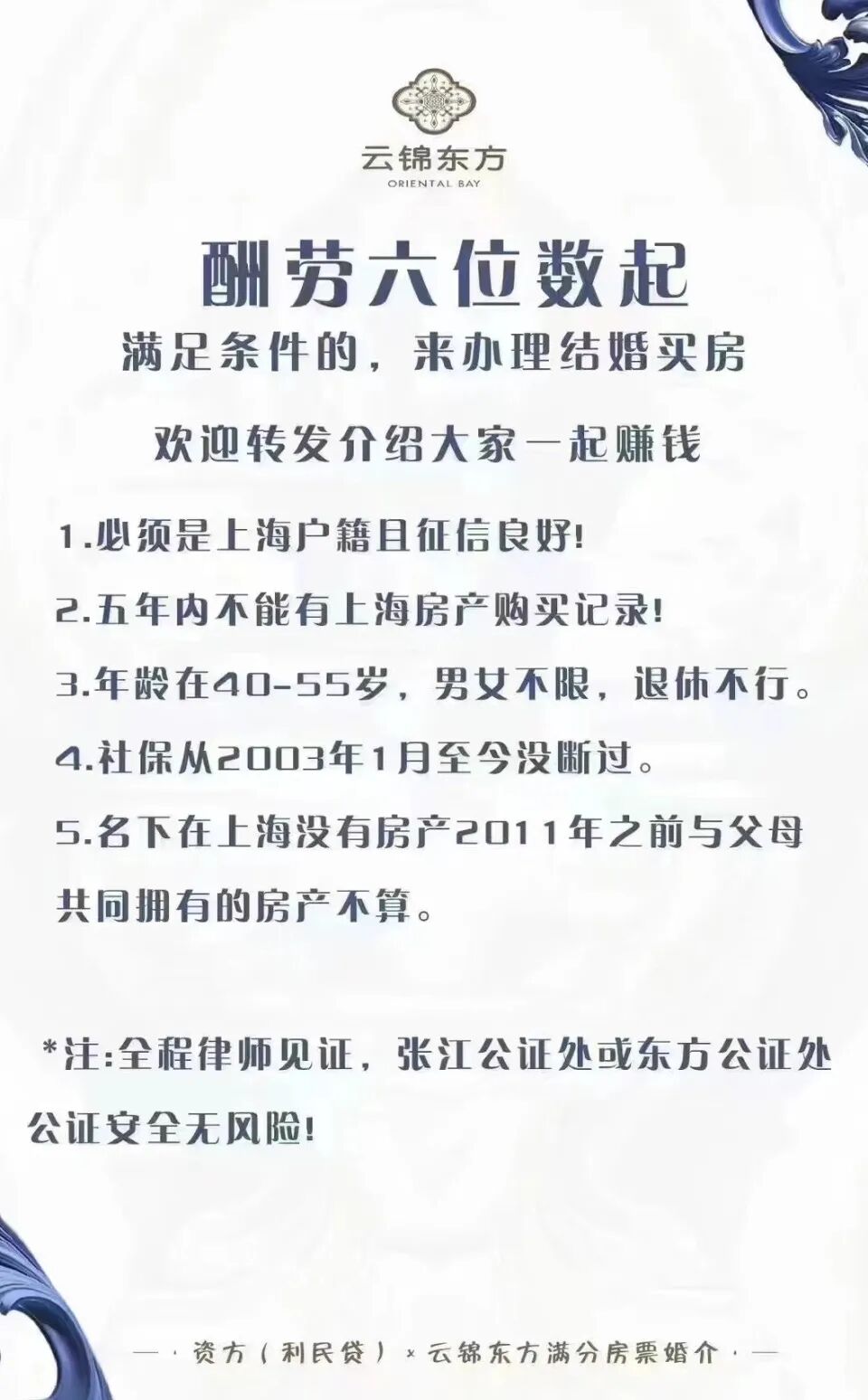 但从法律层面而言,由于“满分代持”模式是与他人在法律上真结婚,并不存在违法被追查的风险。而在符合上海购房政策、符合项目认筹条件的前提下,开发商并不能拒绝此类购房者参与认购。
