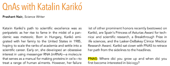 卡里科访谈:mRNA技术突破性论文投Nature,24小时被拒稿,最后Immunity接收 by 赛先生