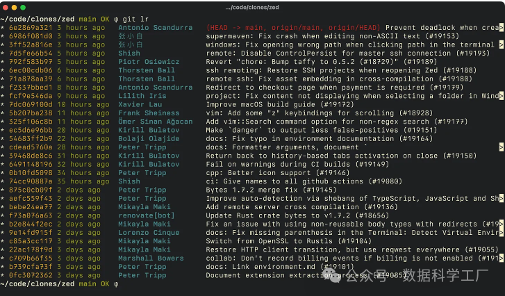 我每天都在~/.githelpers文件中使用pretty_git_log这个函数上百次。我是从Gary Bernhardt的一个屏幕录制中得到这个函数的,并且在过去12年里一直没有对它进行过任何修改。这个函数的输出看起来是这样的: