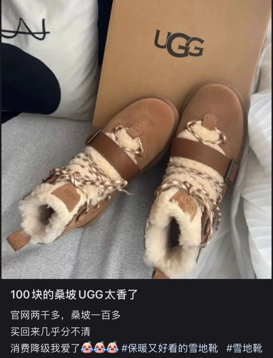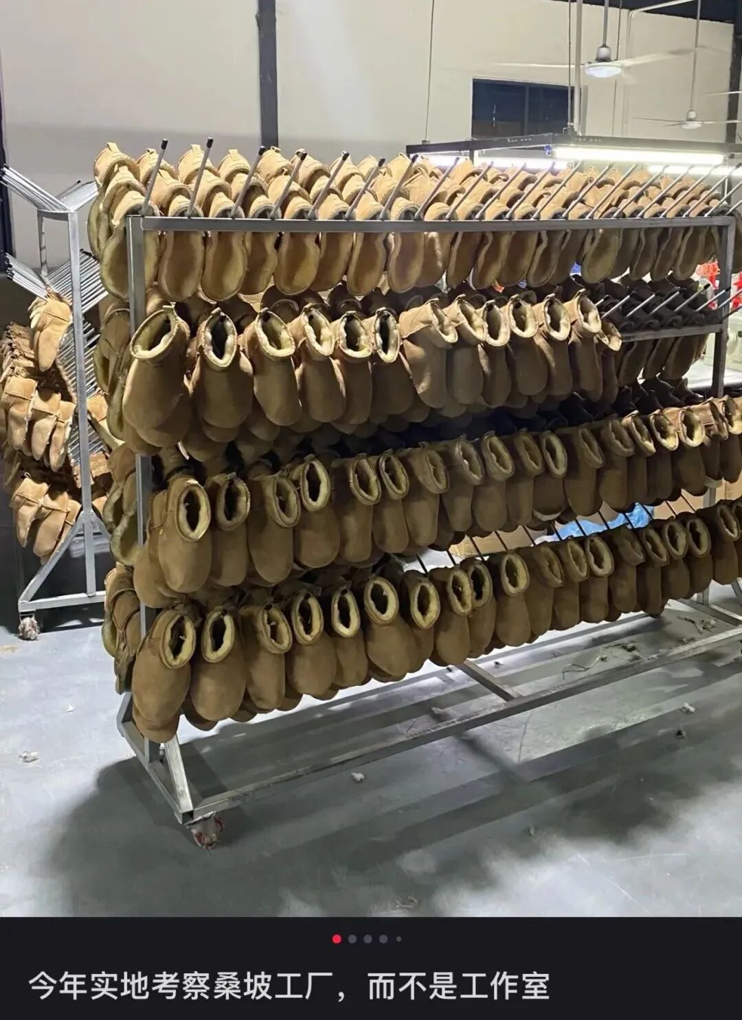 除了仿制以外,桑坡也在利用当地优秀的制革基础,开发新的营收方式。有的店家开始售卖质量优越的白牌产品,试图摆脱品牌的束缚。还有几个桑坡店家联合起来,建立属于桑坡本地的原创雪地靴品牌。然而,虽然有着上乘的质量和明显优于其他竞品的价格,但是和那些已经在全球流行的雪地靴相比,它们太过相似的外观又让从各地赶来进货的中产们看完,连连后退。毕竟,中产的死穴不是买假货,而是买到了“一眼假”。于是,老板怕消费者多举报一次,消费者怕老板多收100。在桑坡度过一个周末,对从外地赶去凑热闹的中产们来说,既是购物,也是博弈。▲ 图 / 小红书用户@壹贰