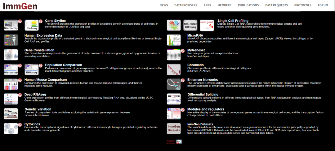 ImmGen 是「全球最全面的小鼠免疫细胞组学资源库」,由多个阶段(Phase I、II)、多种技术(芯片、RNA-seq、ATAC-seq、单细胞)和相关网络项目组成,旨在为免疫学和系统生物学研究提供最可靠的基线与参考。