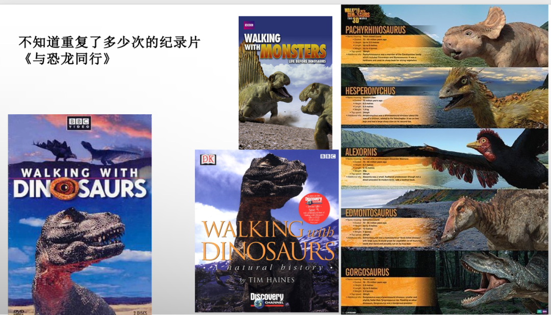 她是幼儿园时就沉迷于恐龙,所以给她看了恐龙纪录片《与恐龙同行》,和《与怪兽同行》。幼儿园的两三年,我们家早饭晚饭吃饭时间,都在反复看这两套纪录片(有10 多集),画面上一只恐龙走出来,解说话音还没开始,小孩已经抢先说出了解说的台词。后来苹果出了《小小世界》(Tiny World),《七个世界一个星球》,每套会看几个月。