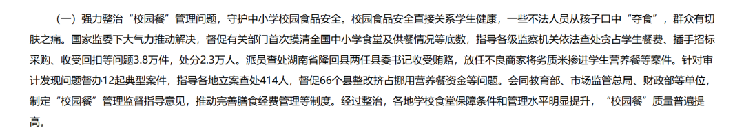本刊记者发现,近几年内,校园餐曾多次出现问题。2025年4月7日,据《人民日报》报道,山西省临汾市汾西县第二中学校原校长赵孟锁利用学校向有关部门报送的膳食费用与实际花销存在差距的漏洞,截留、套取学校食堂420多万元膳食经费,占食材费总额的40%,同时还存在食材以次充好、菜品以素代荤、结余食材去向不明等情况。2024年,中央纪委国家监委在全国部署开展中小学校校园食品安全和膳食经费管理突出问题专项整治。截至2024年12月,国家监委指导各级监察机关依法查处贪占学生餐费、插手招标采购、收受回扣等问题3.8万件,处分2.3万人。