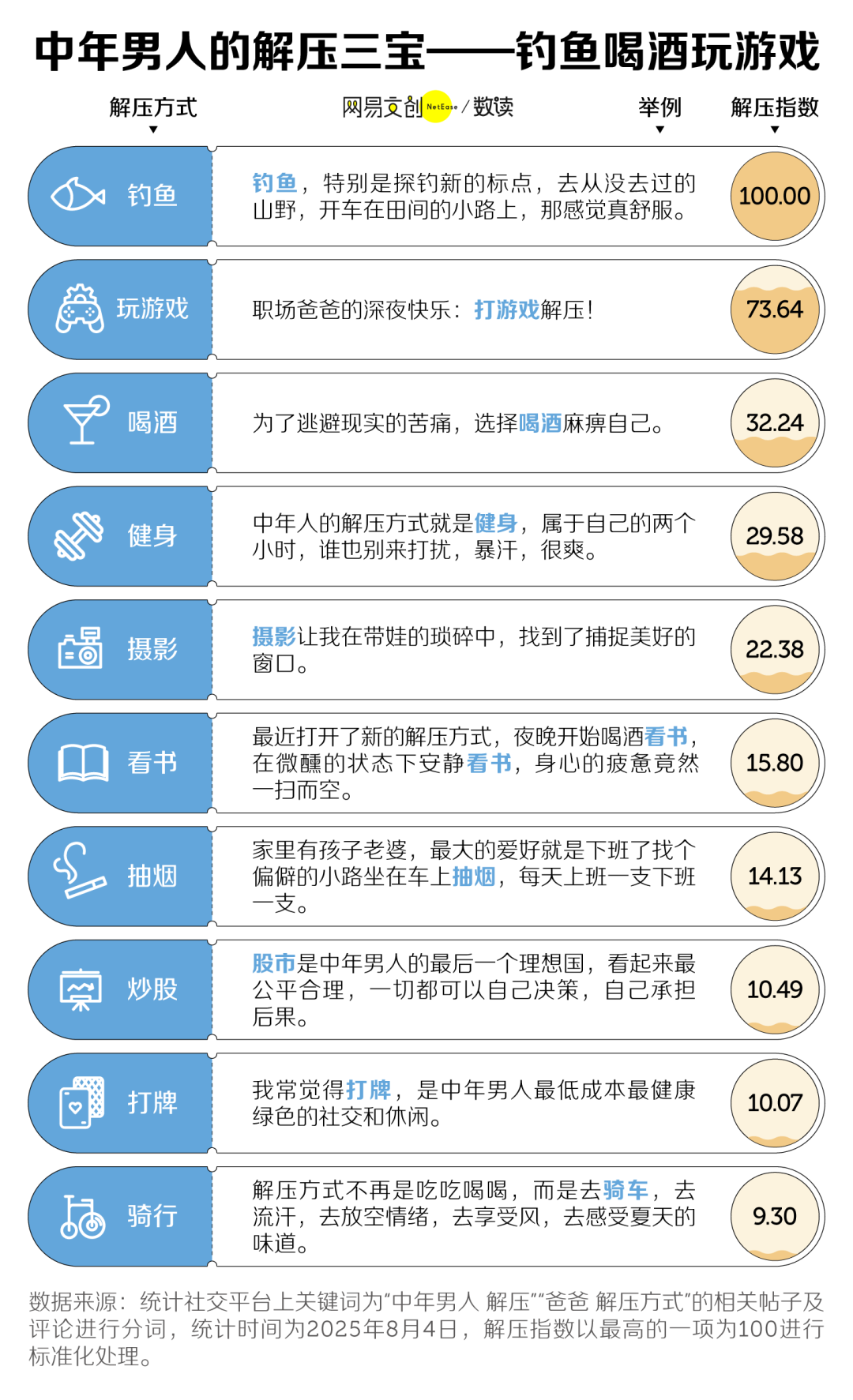 我们统计了社交平台上关于中年男人解压方式的讨论,发现他们的终极避难所,是钓鱼的鱼塘。多少钓鱼佬,工位坐上一小时就腰酸背痛,但河边一坐就是一天,只不过,他们能钓上海草、衣物甚至尸体,就是唯独钓不上鱼。