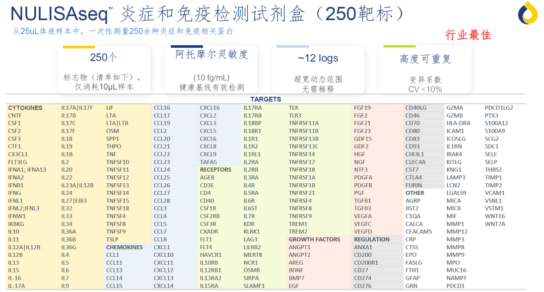 公司专利的NULISA™技术和ARGO™ HT自动化平台相结合,作为兼具“超灵敏”和“超多重”检测性能的突破性蛋白检测系统,在同一个平台上同时具备 “高通量蛋白质组学” 和 “聚焦蛋白标志物” 两种检测模式。借助fg/mL级的灵敏度,超多重检测能力,12个log的动态范围,全自动工作流程和一以贯之的特异性,形成了第一个有机会赋能蛋白标志物 “从发现、验证、到转化” 完整生命周期的技术平台。