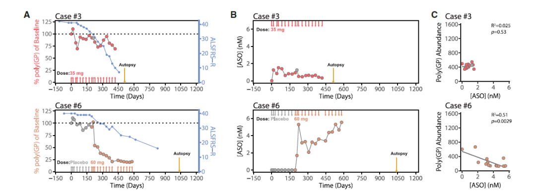 - ASO治疗后c9ALS患者体液生物标志物分析:免疫测定ASO治疗后的c9ALS患者脑脊液中poly(GP)(DPR标志物)和BIIB078的含量,发现6例患者中有5例患者的poly(GP)降低(平均降低37.2%),但个体差异显著,且临床评分没有相关性(ALSFRS-R)。BIIB078的含量和poly(GP)的水平也呈现很大的个体差异,4例患者没有相关性,2例存在相关性,这说明poly(GP)并不是可靠的BIIB078药效评估指标。