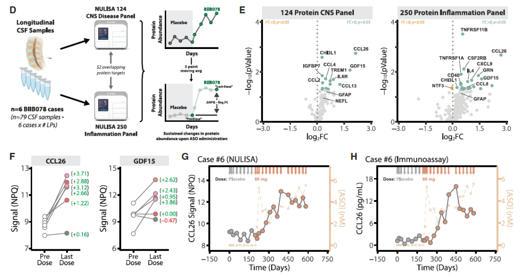 - BIIB078治疗后c9ALS患者免疫图谱分析和新型药效学生物标志物筛选:为了筛选鉴定BIIB078药效评估的可靠标志物,研究人员采用了NULISA(NUcleic acid Linked Immuno-Sandwich Assay)超灵敏蛋白组学技术(该技术检测灵敏度可达fg/mL级别,同时可在uL级的临床样本中一次性系统性定量检测数百种蛋白靶标),借助NULISAseq中枢神经系统检测试剂盒(120+靶标)和NULISAseq炎症和免疫检测试剂盒(250靶标)【具体检测靶标清单见文末】,分析了6例接受BIIB078治疗的c9ALS患者的79个脑脊液(Cerebrospinal Fluid, CSF)样本,比较第一次和最后一次给药后的蛋白水平。结果发现,促炎细胞因子和细胞因子受体显著增加,包括TNFRSF11B、CSFR2B、GDF15和CCL26等。其中CCL26在所有病例和时间点表现出稳健且持续的增加,而且CCL26在两个NULISAseq Panel中呈现非常一致的结果。经过独立免疫测定也验证了CCL26可作为BIIB078的药效学生物标志物。