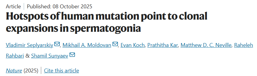 2. Seplyarskiy V, Moldovan MA, Koch E et al. Hotspots of human mutation point to clonal expansions in spermatogonia. Nature. 2025 Oct 8. doi: 10.1038/s41586-025-09579-7. Epub ahead of print. PMID: 41062699.