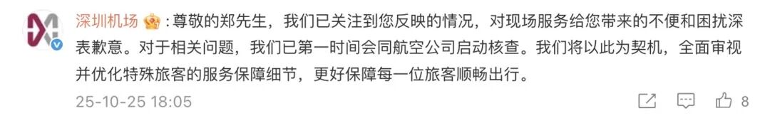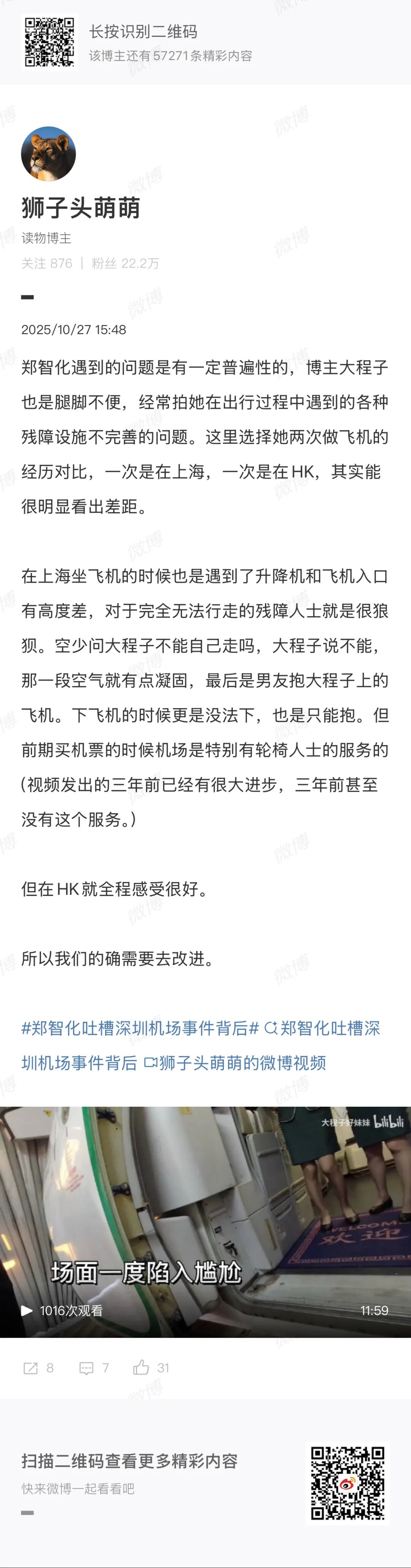 至于那些情绪化的表述,那是任何受了委屈的人都有可能出现的,如果轮椅能够推进去,你以为会有任何人希望被搀扶进去么?郑不可能是第一次坐飞机,如果不是确实体验到了差距,以他那样的修养,断然不至于发这么一条微博。原本机场官方在微博上的回应非常得体,如果事情到此结束,也不失为一次改进公共服务的良好契机,但视频放出来,又导致郑遭到山呼海啸般的批评甚至谩骂,这帮骂郑的,希望得到一个什么结果呢?该机场的服务已经够好了?乃至所有机场的服务已经够好了所以不需要任何改进了?一个社会的文明程度取决于它如何对待弱势群体,作为一个身体健全的人,如果恰好在心智方面又特别愚蠢,那确实是没法体谅残障同胞出行的种种困难,但令我惊讶不已的是,在这次问题上,暴露出来的蠢货居然如此之多,简直铺天盖地傻气腾腾。退一万步说,就算你现在是体格健全的青壮年,难道你就没有任何一个身体有障碍的熟人和亲友么?你自己就没有老去的一天么?无论从哪个角度来说,郑先生的呼吁都将对公共服务有促进作用,我们没有任何理由认为,目前的公共服务水平已经好得不能再好,好到没有继续提高的必要了。我从来不承认我有粉丝的一个重要原因是,很多关注我的人,脑子根本就不好使,不信大家可以去围观我转发此事的微博,留言区照样大把大把傻不拉几的玩意儿,比其余的涉及此话题的留言区强不了多少。善良,是技术活,愚蠢的人既无起码的同理心也没有基本的是非观念,他们怎么可能善良?当他们是男人时,他就理解不了女人的恐惧,当他们是青壮年时,他们就理解不了老人和孩子的难处,当他们是健康的人时,他就理解不了病人承受的痛苦,当她们是女人时,她就理解不了孕妇和抱小孩儿的同胞出行有多麻烦……在这帮大傻子的世界里,所有不适合出行的人最好就永远呆在家里,永远不要出现在公众的视线里,就放佛他们自己会永远身强力壮永远不会变成弱势群体一样。要明白,一个可以让弱势群体也感到很舒适的系统,也一定能保障更多人的权益。与之相反的,如果只有强大的人才能良好生存的世界,那不就是丛林么?我大致能猜到那帮骂郑的人出于什么动机,但这一点我不想往深里说。让人略感欣慰的是,虽然在各种社交媒体平台上骂郑的一方目前是绝对的压倒性的大多数,但总还有冷静的清醒的人在发声,比如截图下面这一条。每一个人都注定或多或少地影响世界,郑先生是那个让世界变得稍微美好一些的人,在这次事件中,那些因为郑的批评而试图着手改进服务水平让残疾同胞出行更顺畅的人,也是让世界变得更美好一些的力量。而那些骂郑的,你们傻不拉几的人生就瞎活吧。虽然你们的存在让这个世界变得又恶心了一点点,但是文明世界有极大的包容性,你们也活得下去。不过,如果有一辆叫文明的列车,有些蠢货是登不上去的。