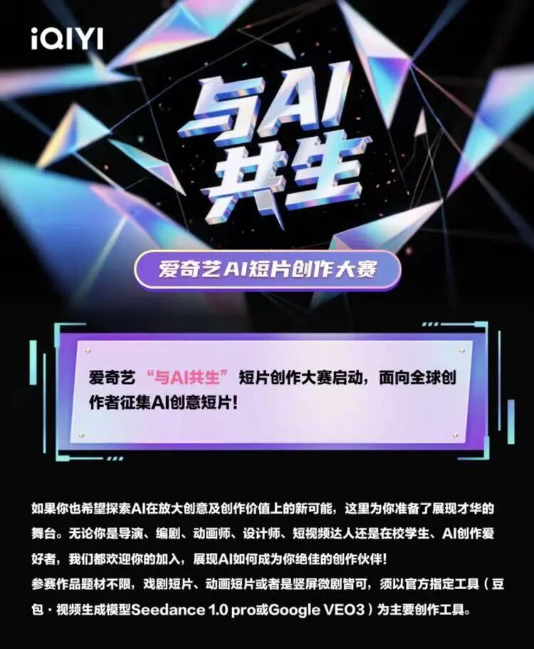 这与迪士尼起诉Google的逻辑如出一辙:在没有达成利益分配机制之前,免费的才是最贵的。索赔当然是一方面,更重要还是为了在法律层面确立长视频平台作为“数据版权方”的地位。在进攻端,爱奇艺正在展示一种“技术中立”的开放结盟姿态。它深知自己无法自研底层模型,因此选择与最强的技术方合作。在7月启动的“与AI共生”短片创作大赛中,爱奇艺同时拉来了拥有Veo模型Google和坐拥即梦AI的火山引擎作为技术合作伙伴。“不把鸡蛋放在同一个篮子里”的策略,让爱奇艺能够第一时间测试全球顶尖模型的成色,并反哺自身的创作生态。同时爱奇艺也开始测试AI在专业内容生产上的能力边界。9月,爱奇艺联手奥斯卡最佳摄影奖得主鲍德熹,启动了“鲍德熹·爱奇艺AI剧场”创作营。