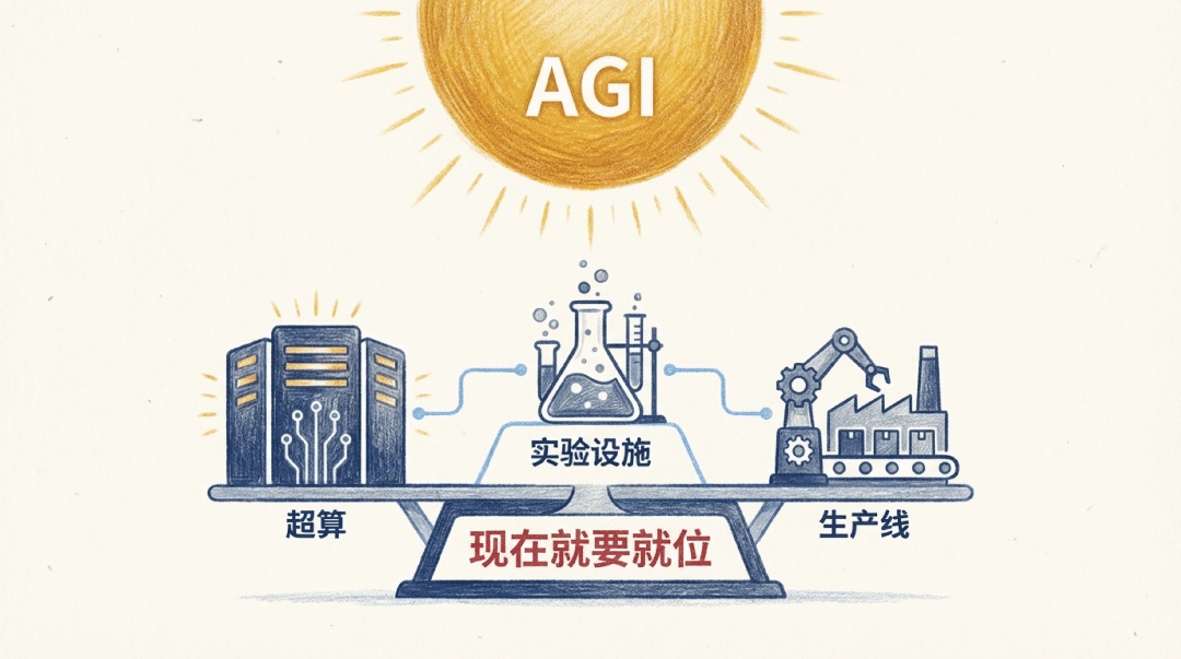 • 美国有 OpenAI、Anthropic 这些前沿实验室,他们在冲刺模型能力, • 美国光有模型不够,还得有超算、实验设施、生产线准备好接住 AGI,把它变成实际的科学和工业产出 • 这些基建,不能等 AGI 来了再想,现在就要就位
