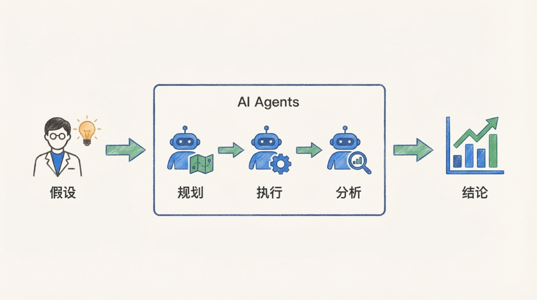 他们现在跑的是完整的 agent 工作流:假设生成 agent 规划方向,设置 agent 配置参数,执行 agent 跑仿真,分析 agent 处理结果,最后反馈给科学家