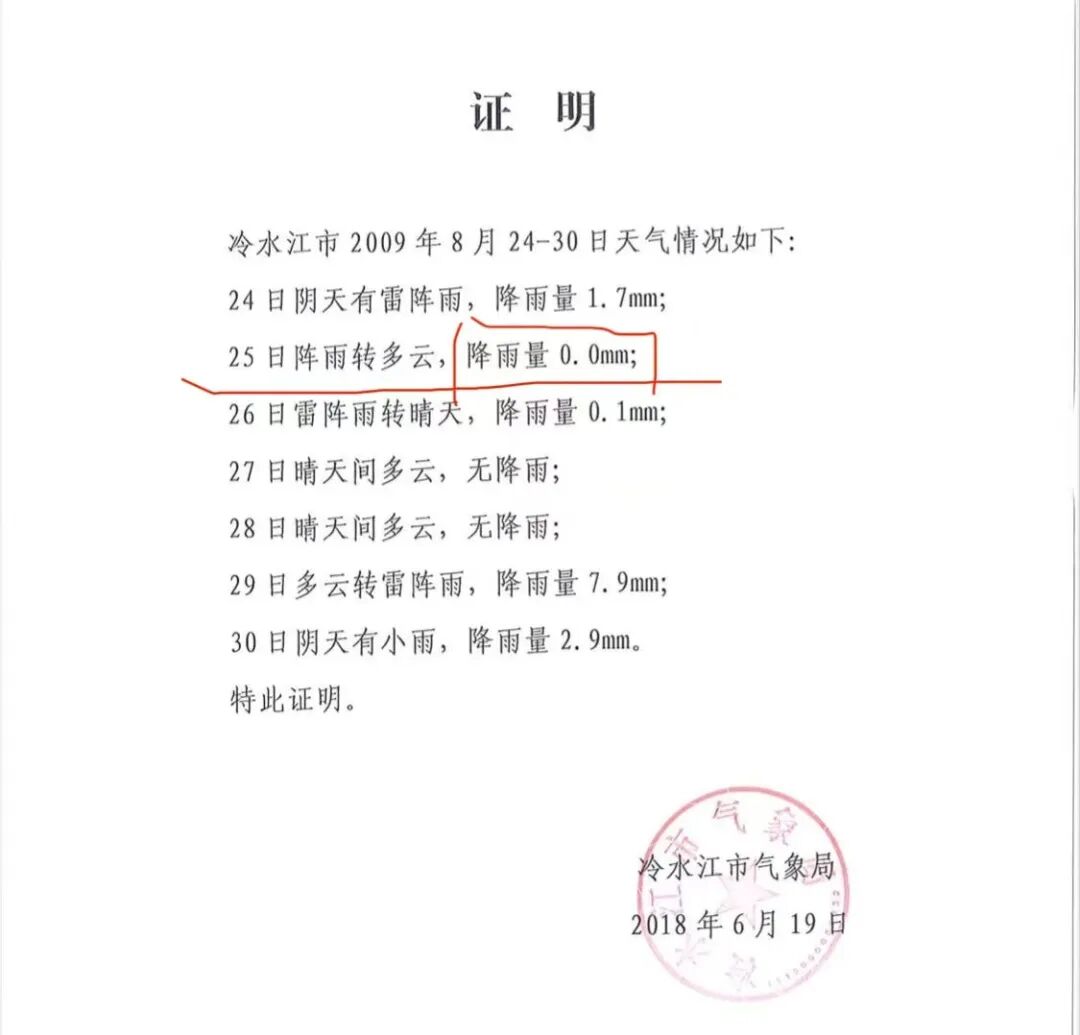 【根据案发小区经纬度查询,案发当晚17点以后降雨量为0(意味着没下或者即便下了也可忽略),与冷水江气象局及媒体报道、证人证词相符。】