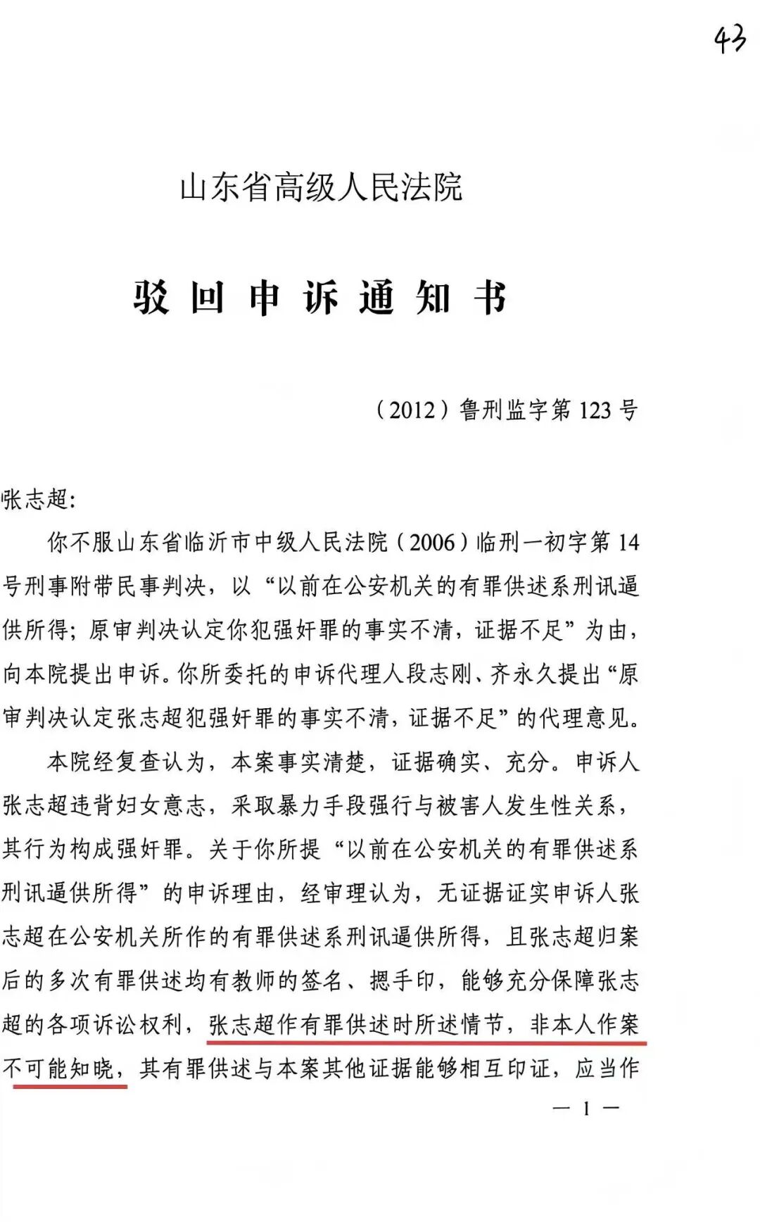 2012年张志超的申诉被山东省高院驳回时,通知书里还有这样一句话: