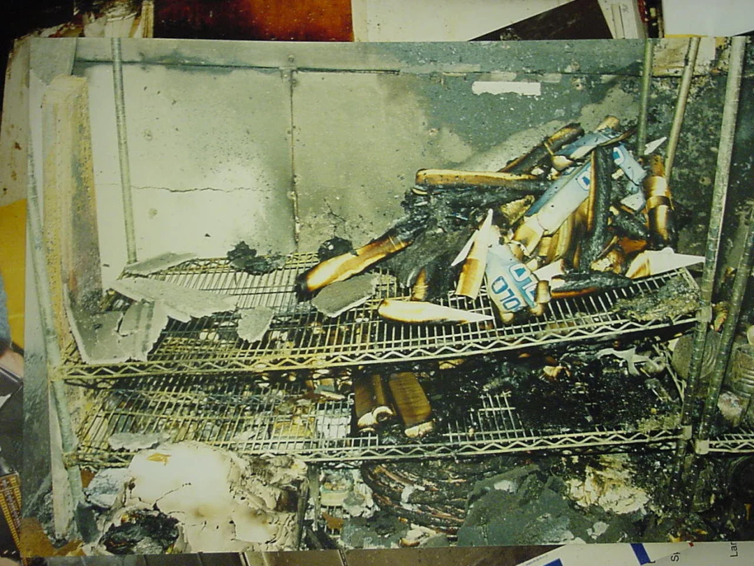 火灾肆虐,店内被烧得一片焦黑,储藏室内一把厚重的铝制梯子,顶端的阶梯都被烧熔了,由此可见尸体的烧毁程度。