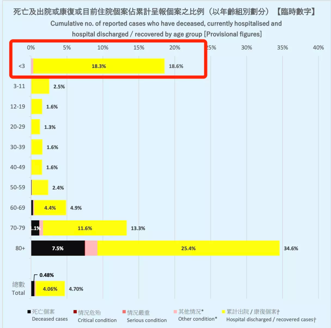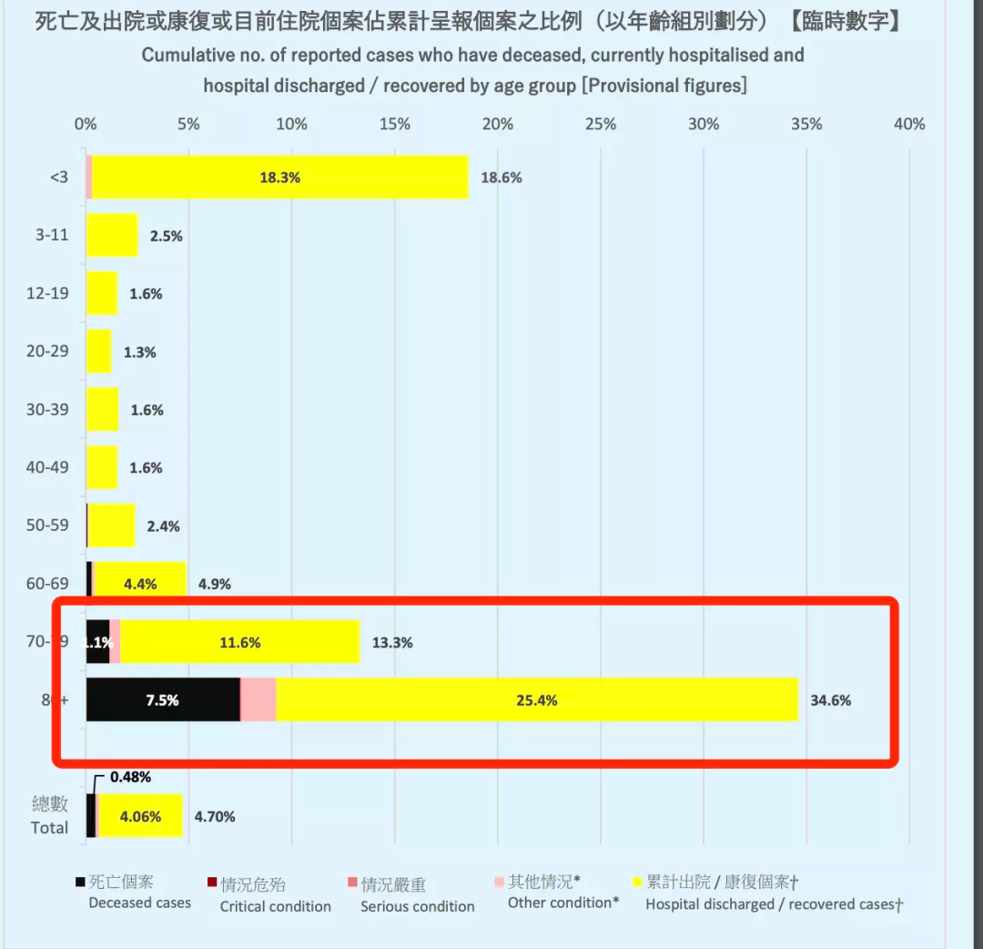 如果你家里有老人,老人重症/死亡的风险本就高,更需要充足的医疗资源兜底。在中国香港 2021 年 12 月到 2022 年 12 月的奥密克戎浪潮中,80 岁以上的老人中,34.6%的人需要住院,相当于每 10 个老人中,就有 3 个需要住院。